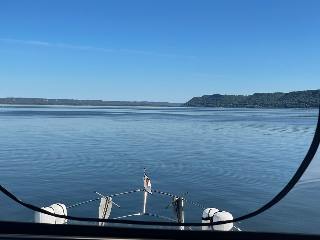 Ok the first day it was just great to get some firsts behind us…made it through Kinni, under Prescott rr bridge, first lock #3, side by side with big tow right in entry to Lake Pepin, docking in first destination Parkside marina in Wabasha with 5 feet of water and lots of green.