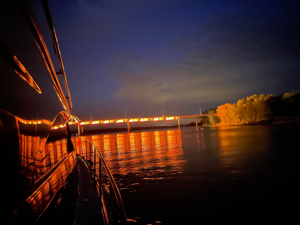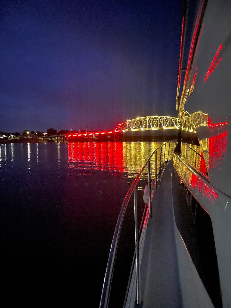 Between the wing dams. So no choice but to anchor in Rick Peterson’s recommended spot on opposite bank below the bridge. I liked that the water seems deep close to shore, my aqua map app had some soundings in the area. We position outside the channel and drop the “ok, it’s for the loop” $2400 65 lb ultra anchor. Put out 140 feet of chain, a mantus bridal, set the anchor alarms, the wind dies down more than forecast and this ain’t so bad!