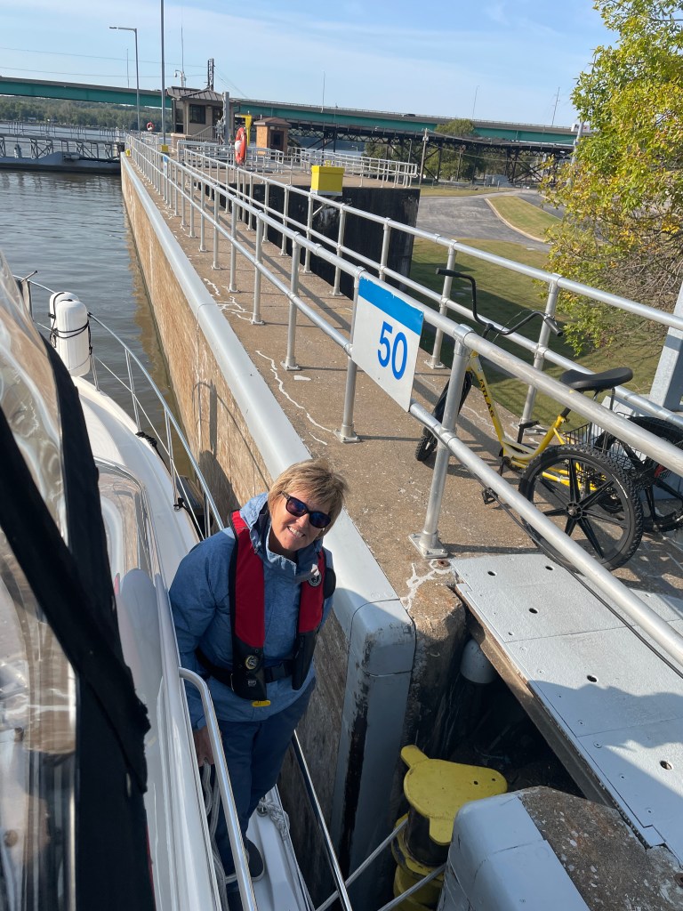 The next morning we departed for the Quincy Boat Club dock. Lock and dam 20 was only a mile downstream, so we called first and they had a tow just arriving. So we enjoyed a little more time on the dock, gave me time to do a short run. This lock was first using a bollard to hold you on the wall, and the water level dropped 38 feet, by far the largest of the trip so far.