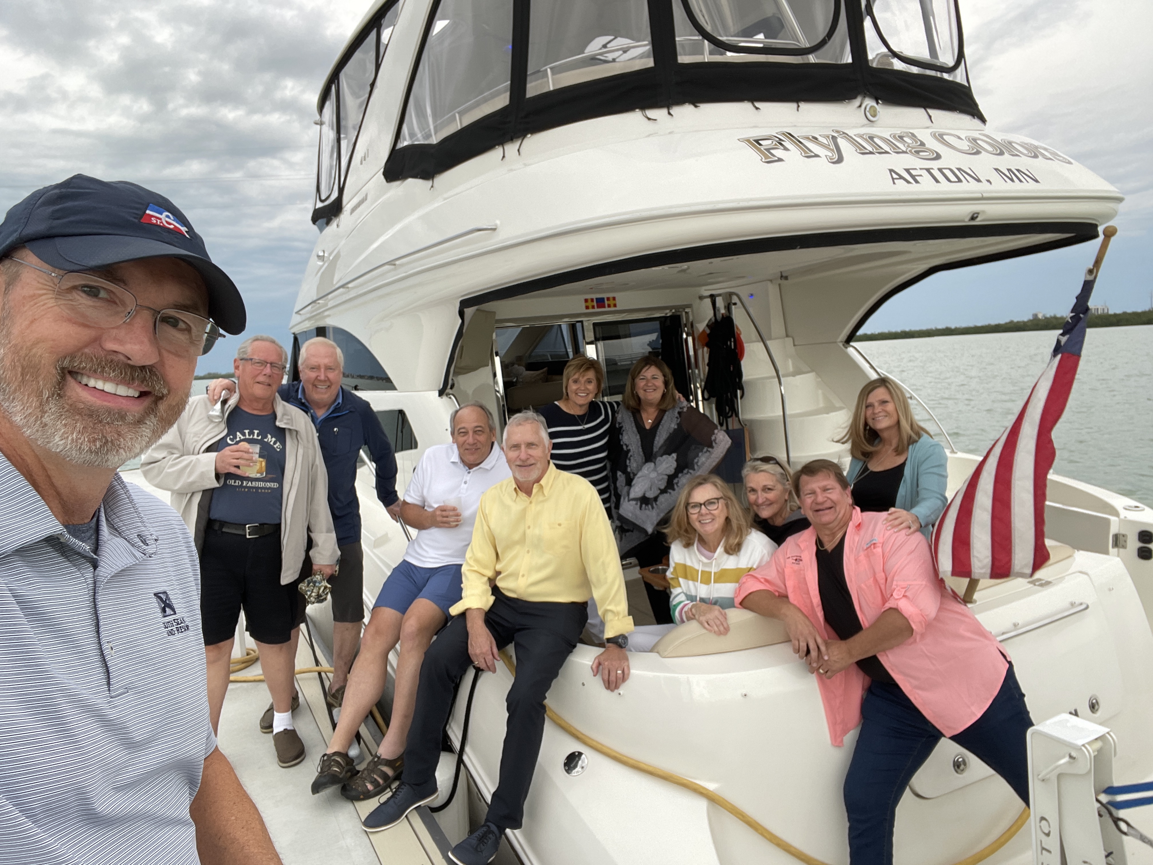 Just happen to snag this photo as I was in the Galley doing dishes, as this boat came crusing by at a fairly good clip with these passengers on board their motors. Hilarious!Rip and Lilly from Afton Marina now reside in Ft Myers in the beautiful community of Gulf Harbor. We loved their spacious condo and enjoyed dining with them at the restaurant on property. This was one of those impromptu get togethers and we’re so glad it happend.What a surprise! We reconnected with Scott and Nancy who just purchased a home in Naples. Scott and Ron worked together back in the late ’90s. Hopefully we will catch them again on the Loop at their summer home in MI.Met up with dear friends who used to reside in MN now retired and living in OR. This was a planned get together at the Pink Shell Resort and Marina on Fort Myers Beach, but always thankful when the weather works out and we are able arrive at our destination as planned. Enjoyed the free umbrellas and chairs on the beach, the cocktails and the heated pool at Pink Shell.These two SCYC friends found us in Naples so we had brunch at the beautiful Naples Sailing and Yacht Club. Then we made a much needed Costco run.We had 16 SCYC friends drive from all over SW FL to dine at dinner at CJ’s on the Bay on Marco Island, some were able to join up with us on the boat prior to dinner. Made us kind of homesick but we sure do appreciate this gang and the effort they made to connect.Afton Marina “D” dock neighbors and friends, Bruce and Suzi shared wine with us on Flying Colors, then we dined at Marco Island Yacht Club and celebrated Suzi’s Birthday!These two were incredible harbor hosts to us. They loaned us a red Jeep, invited us to a home cooked meal at their home, which was a real treat and let us use their “tubs”, both laundry and hot tub. They spoiled us with a brunch at their club in their development and because of these two we had a truly Re-Marco-able time on Marco Island. Many thanks!