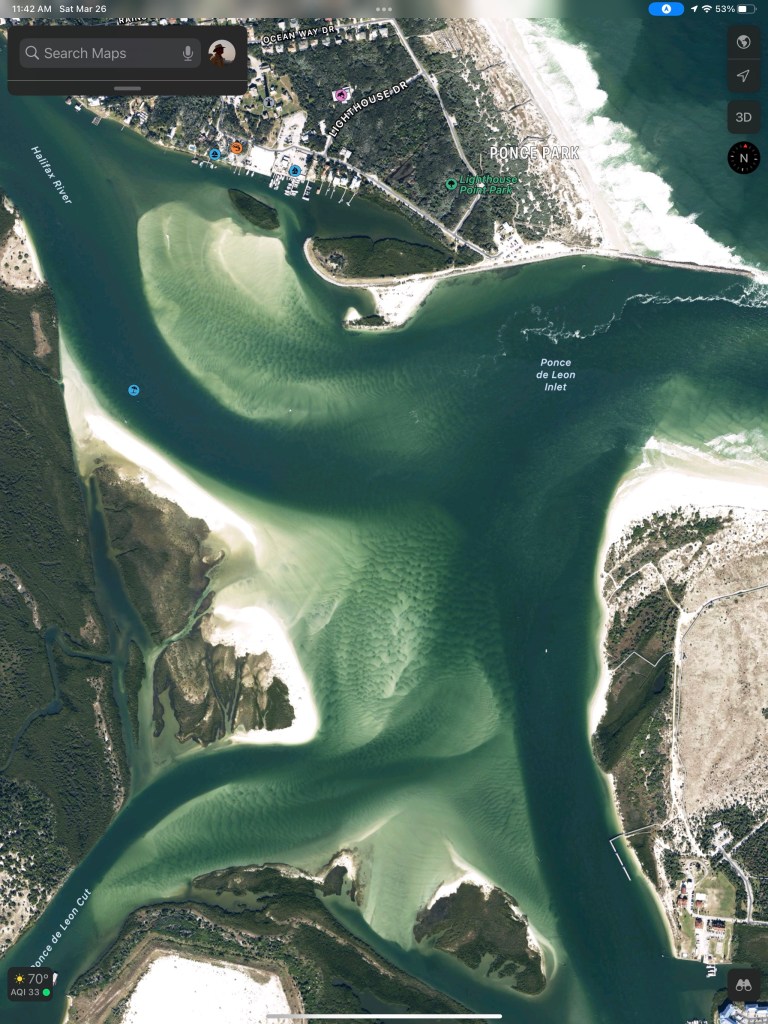 We had a tense moment at this point in our travels through this Ponce de Leon Inlet route. If you look at the two images above, the left shows our recommended route in red, and the dashed line is where we actually went to avoid shoaling that is so new it wasn’t even in the right place on the chart on the left. On the right is a Google Earth image of the same spot. Turns out there is so much shoaling and changes in this area that they don’t even mark the channel that turns north and to port to go up the AICW. Those shoals were very shallow and thanks to all our maps we crept through the area and never saw less than six feet, but the next day we found out two other boats ran aground in the same area.
