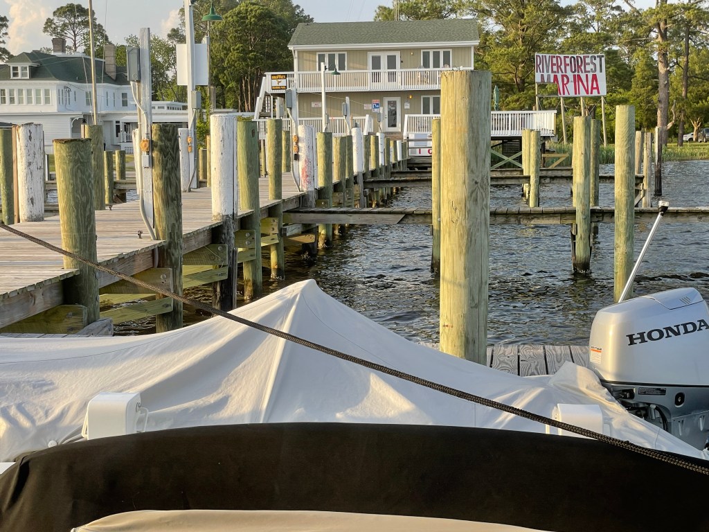 Next morning, we were first to depart for a cruise to Belhaven, to a marina called River Forest. Sounds nice, but turned out to be a wooden dock with some nice fellas wanting to help with lines and a pump out. This was just a dock to tie up to instead of trying to find a spot to anchor out, it was quite windy.