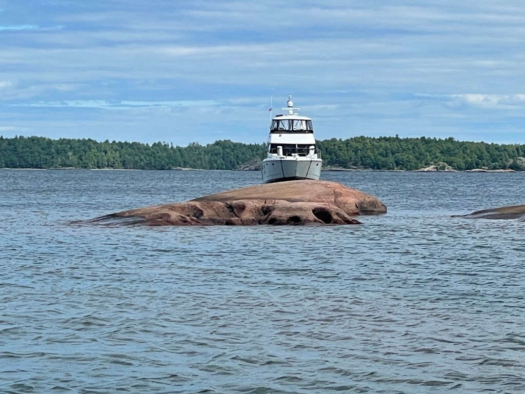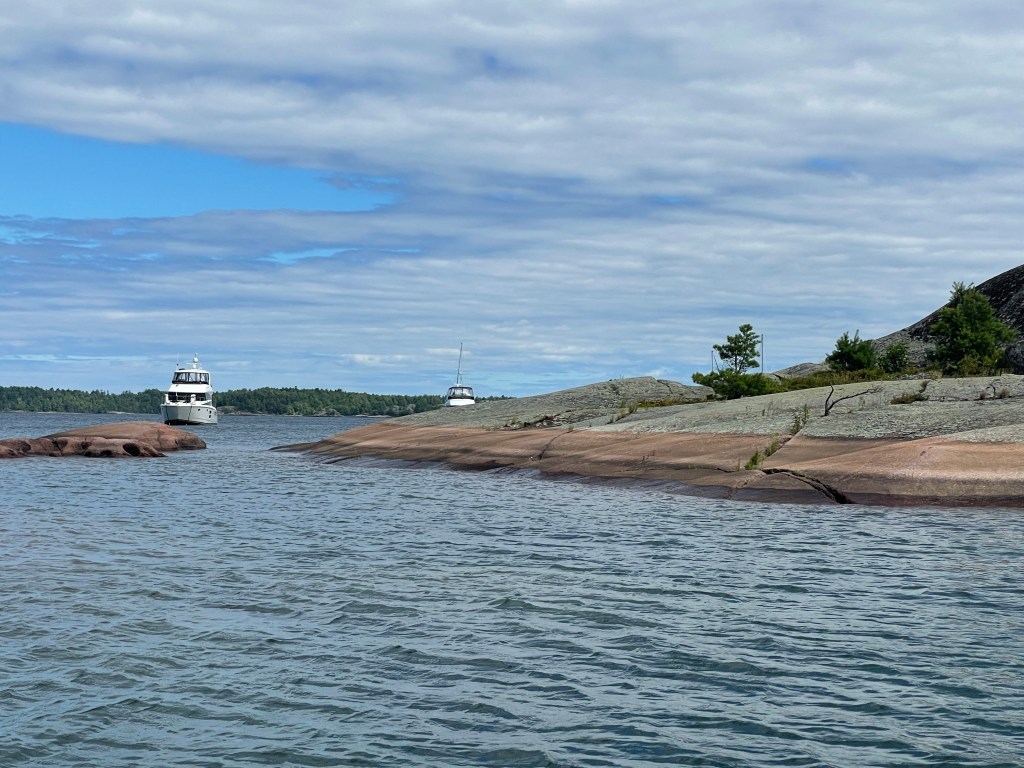 The Benjamin Islands, just 19 miles from Little Current, are known for their smooth pink-colored granite rock formations while being surrounded by pine trees. We anchored in this popular anchorage with many other boaters and enjoyed being surrounded by the unique formations that took form so many years ago.