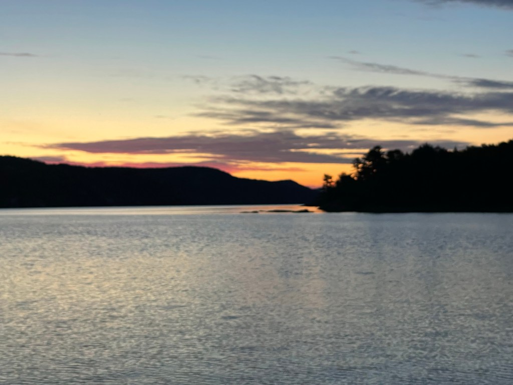 Baie Fine (French for “fine bay” and pronounced “Bay Fin” ) is a 10-mile, fjord-like cut that is most scenic. It was our next stop for anchoring in the North Channel. These Mountains are solid white quartz and often look like they are snow-covered.