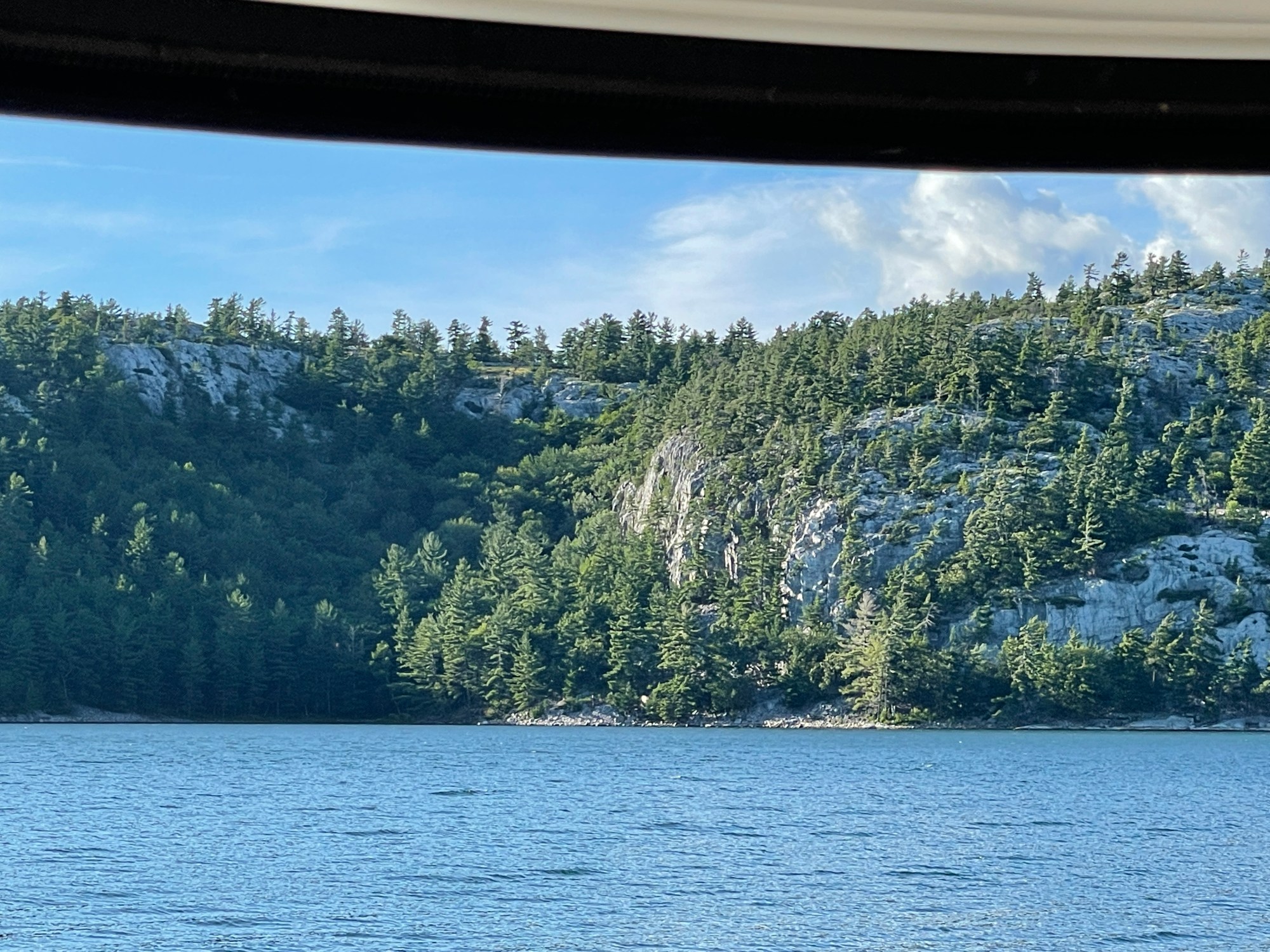 Baie Fine (French for “fine bay” and pronounced “Bay Fin” ) is a 10-mile, fjord-like cut that is most scenic. It was our next stop for anchoring in the North Channel. These Mountains are solid white quartz and often look like they are snow-covered.