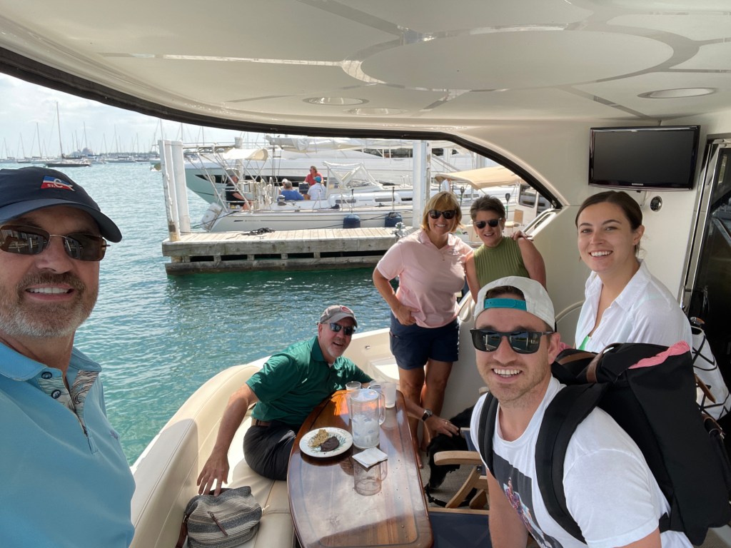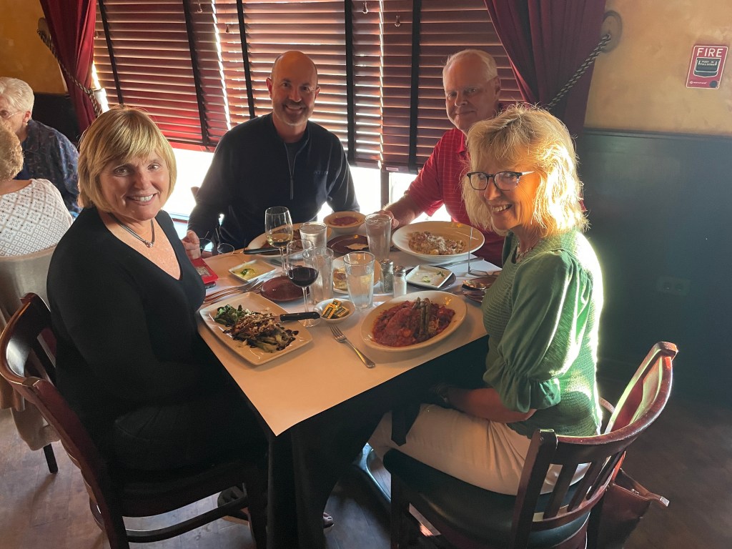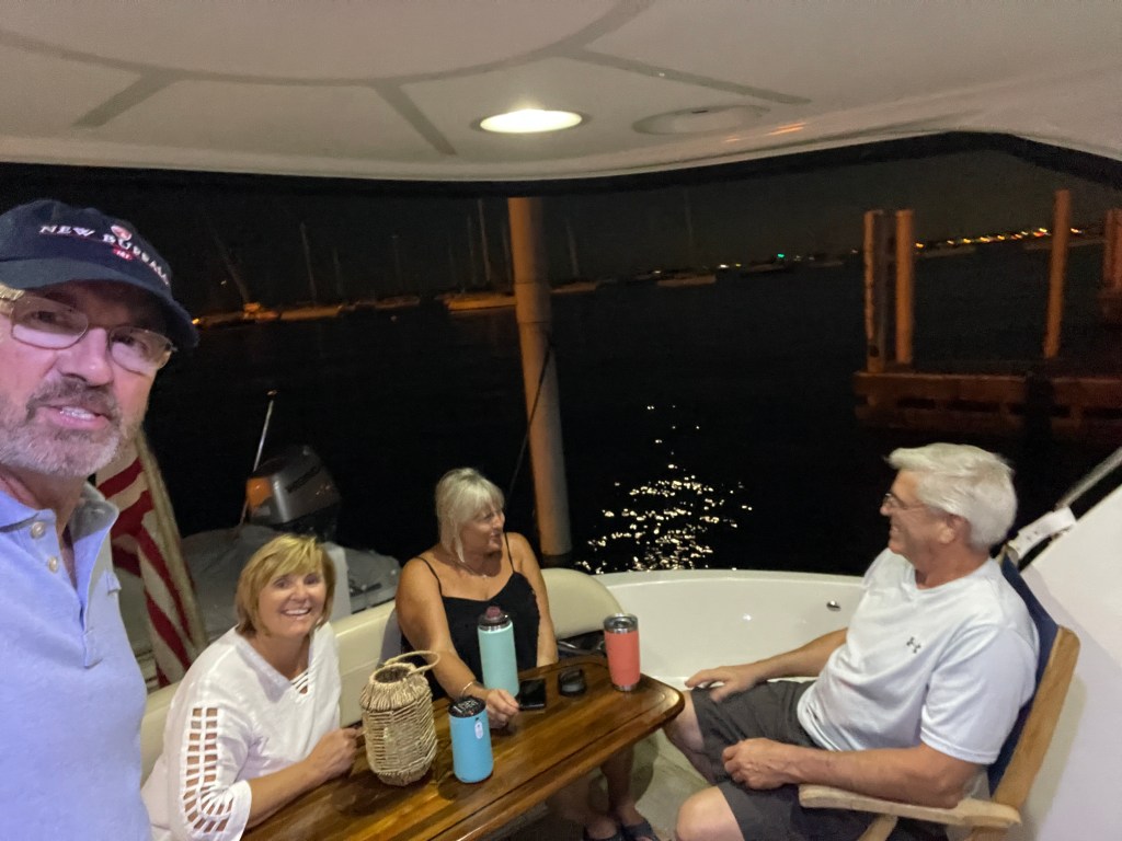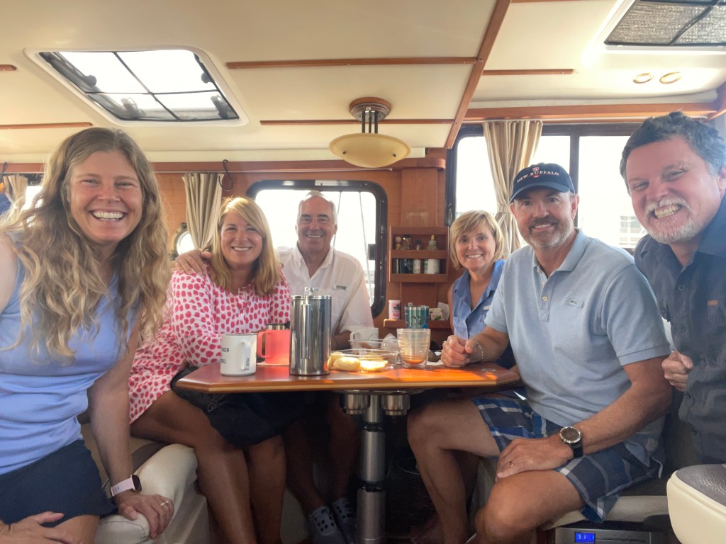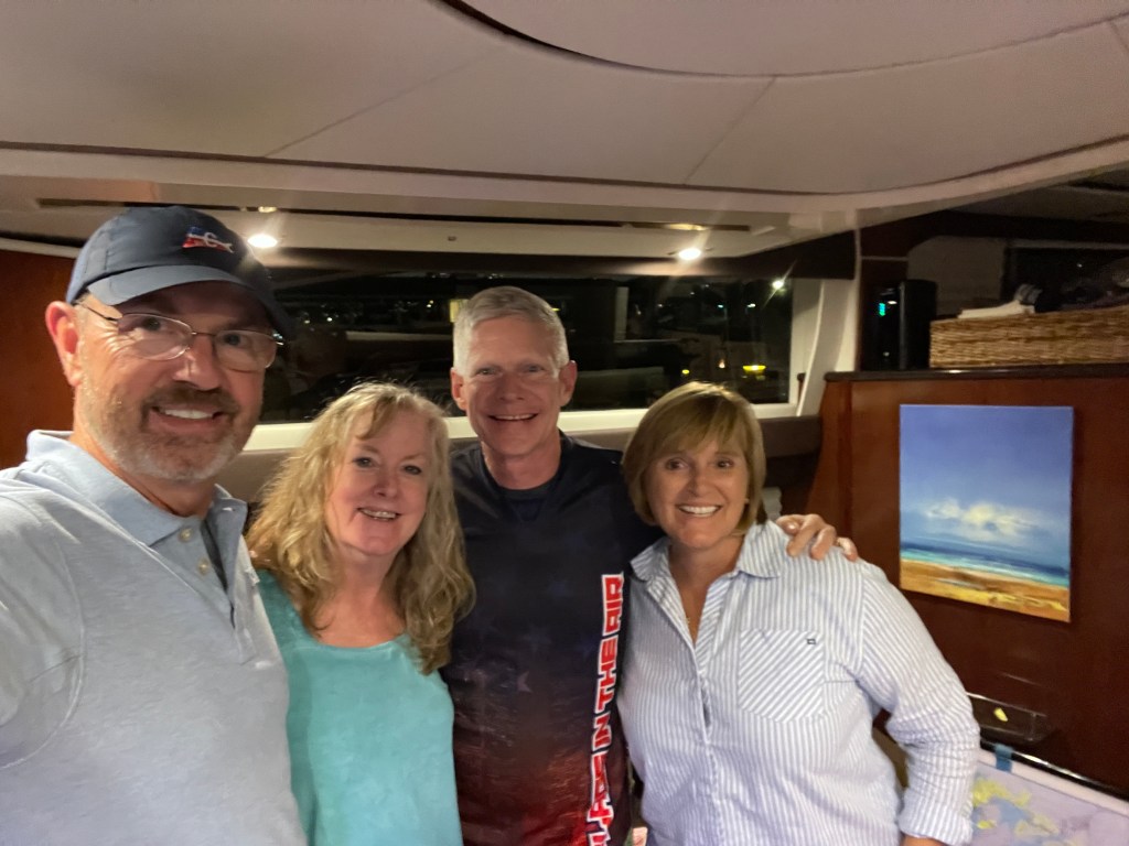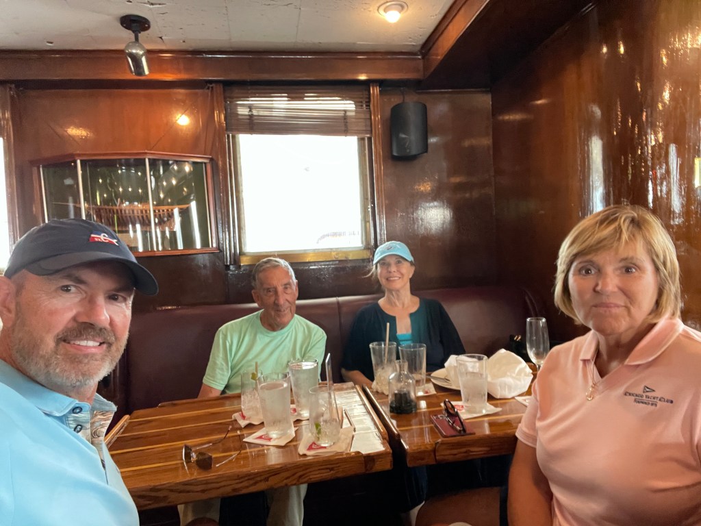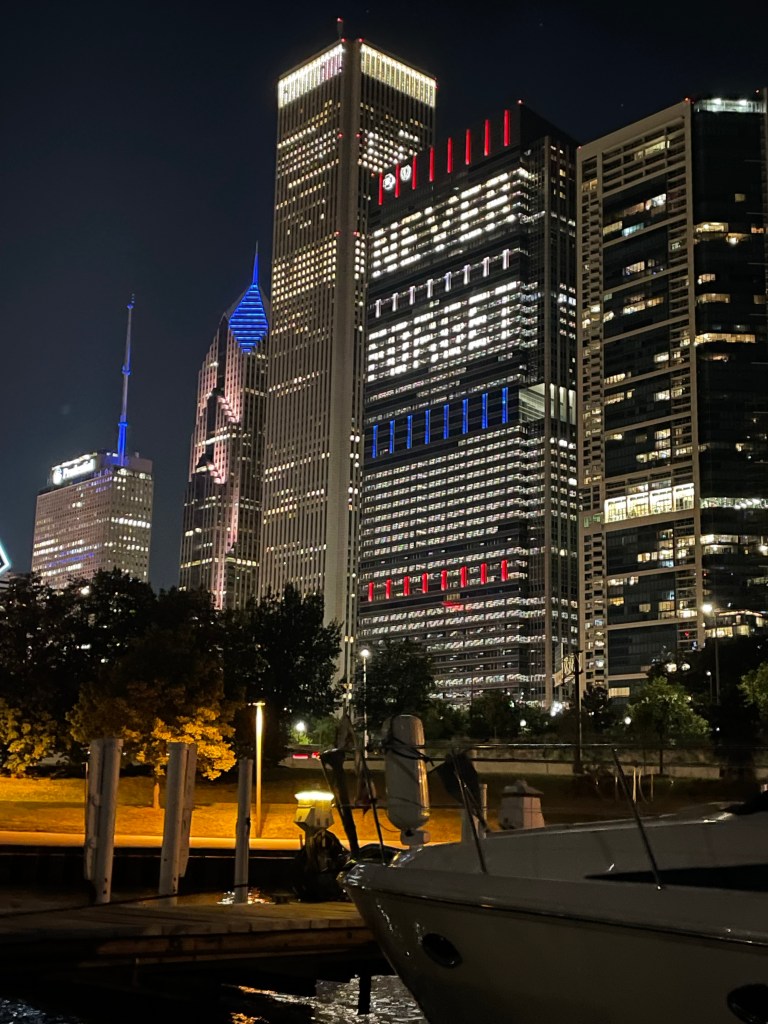 Currently, the Ranger Tug that we anchored in Baie Fin Canada with, caught up with us again.The Blue Cross, Blue Shield building lit up “Never Forget” in honor of 9/11.Great visit with the Kitzenger Family, Tom, Connie, Danny, and KathNo, not docktales, morning coffee with the Loopers from Currently, Bruce and Maggie and Let Time Go Lightly, Patty & Bill.Looper friends from the boat Ultima, who we met in Midland, CA invited us to see the Columbia Yacht Club where they docked their boat. They were both seasoned boaters having cruised to Alaska, the Panama Canal, the Caribbean and now the Loop. They love being on the water and have done four 180-day around-the-world cruises on various commercial ships.Columbia Yacht Club is located right on the waterfront in the heart of Chicago’s sailing scene between Monroe and DuSable Harbors. Their large Club Ship sets them apart from other yacht clubs, this was the main entrance of the 372-foot Ice-cutting ferry named Abegweit, nicknamed “Abby” which houses a bar and restaurants, the sailing school and an event center. This vessel has served as the clubhouse since 1982.Long-time friends, Carl and Judy joined us for dinner at the CYC.Had a great visit with our Rolling Meadows neighbors, Donna and Karl. Camara-shy Cousins, Diana, and Tom came for dinnerWillis Tower, originally the Sears Tower, is a 108-story, 1451-foot skyscraper seen from the water on the Architectural tour and is still the third-tallest in the world. More than a million people visit the observation deck in this building each year. Michigan Ave with its iconic Water TowerThe Chicago River has a 17′ fixed bridge, which meant that our Flying Colors with an air draft of 18.5 ‘ wouldn’t be able to clear the bridge and travel down the river through the city. So we took the Architectural Tour to explore the river and the architectural wonders that line its banks. The tour gives you views of some of the finest old Art Deco, NeoClassical and Gothic Architecture while highlighting the new modern skyscrapers many of which are residential.Two of our favorite buildings, the Wrigley Building built in 1921-24 for the chewing gum company used the shape of the Seville Cathedral and combined it with French Renaissance details. The Tribune Tower, is a 36-floor, neo-gothic architecture, once home to the Chicago Tribune is now condos. A collection of famous building fragments can be found on the outside of the building, many were brought back by correspondents for the Chicago Tribune prior to the construction of the building.This was our first apartment back in 1985, now condo’s with the neighbor built up with businesses.A must-see in Chicago, “the Bean” sculpture, named “Cloud Gate” by the artist, is synonymous with the Chicago Experience. It’s 33 feet high, 42 feet wide, 66 feet long, and weighs 110 tons. Can be found in Millenium Park which is a great gathering spot in the heart of Chicago where one can find concerts, art, sculptures, and a whole lot of beautiful landscaping.Found the train to the burbs to visit some friendsMet up with my walking buddy, Carol for a walk and of course breakfastFound our good friends, the Bryants, and had dinner at Giani’s in PalatineChicago Yacht Club was not only a great location but offered a great city view. , Now on to the rivers . . .