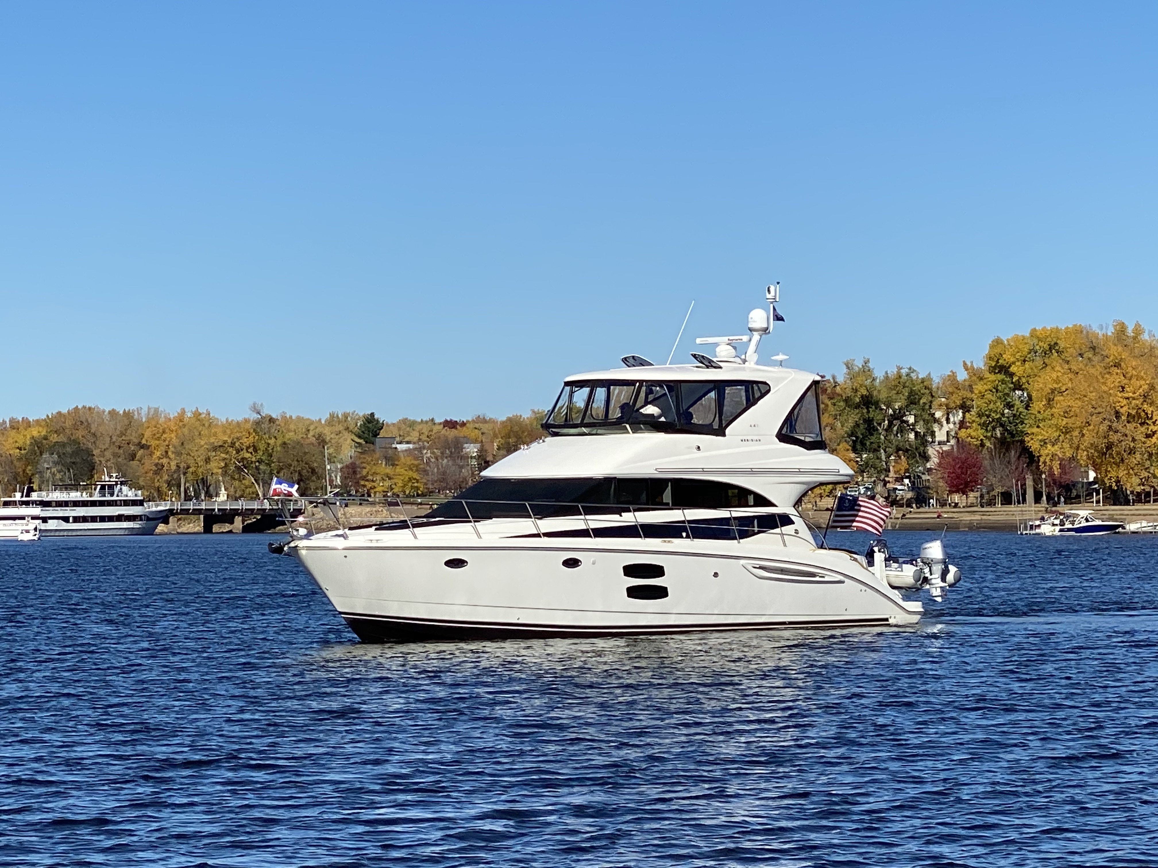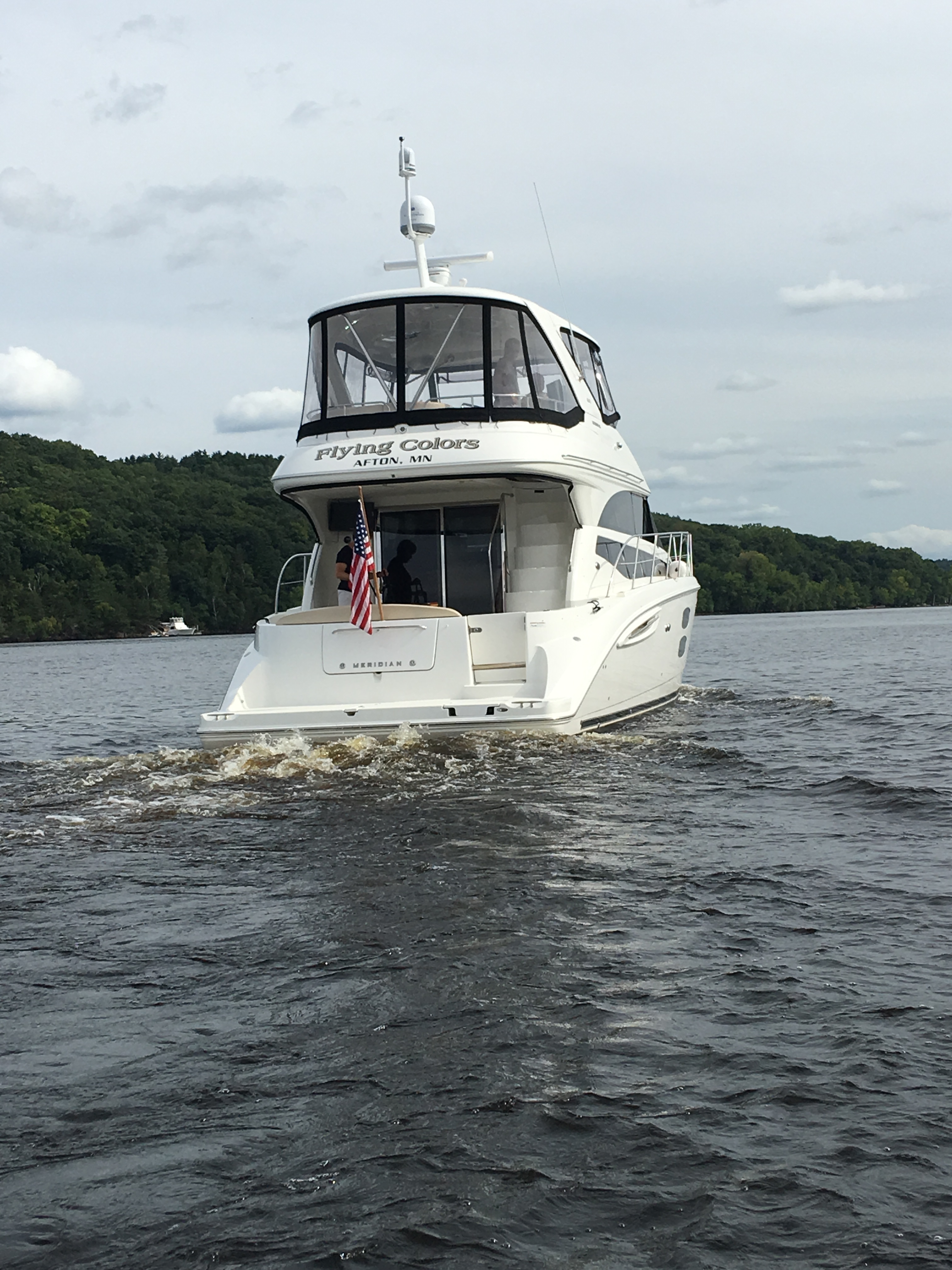 Our boat is a 2011 Meridian 441 that for us is a really good fit for living aboard and traveling for a year. The sky lounge is where the navigation occurs, and the main level is our “home” with no lower helm. The boat is about 47 feet long, has two 480 hp Cummins diesel engines, a 13.5 kw Cummins generator, six AC/Heat units, and holds 150 gallons of fresh water, 55 gallons of black water, 432 gallons of diesel, and weighs about 35,000 pounds.